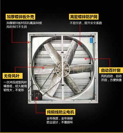镀锌板式负压风机也叫负压抽风机,铁皮风机及畜牧风机是苏州速吉镀锌板抽风机在吸取同类产品优点的基础上,开发研制的实用新型畜牧风机,该系列风机具有全压低、风量大、噪音低、节能、运转平稳、百叶窗自动启闭、维修方便等特点。